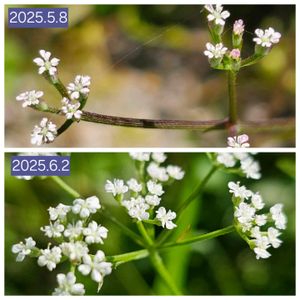 オヤブジラミ(雄藪虱) 上段 ヤブジラミ(藪虱) 下段 いずれもセリ科ヤブジラミ属 3度目の初夏を迎えようやく 2つを区別できるようになったので記録として残します ①花の比較 オヤブジラミが1ヶ月早く5月上旬に開花します 花は桃~紫色がかった白です 花の数はまばら ヤブジラミは6月上旬に開花 花は白色で 1花序に4~10個 密集しています 大きさの比較は? オヤブジラミの方が少し大きい印象 ②果実の比較 オヤブジラミは5~6mmの果実をつけます 小果柄が長めです 大きくて美しい 歩いていると目を引きます! ヤブジラミの果実は2.5~3mm オヤブジラミの半分の大きさです 小果柄は短く果実も小さい この類似した2つの植物が時期を少しずらして花を咲かせ 果実を実らせるのが区別できるようになったのは 今年の収穫の一つです!