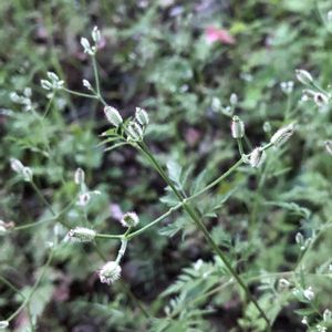 5月15日に公園で花を見つけたヤブジラミ。1週間後には実になっていました。 実にはかぎ状の毛があり、服にシラミのようにくっつきます😆 名前よりかわいい実です。