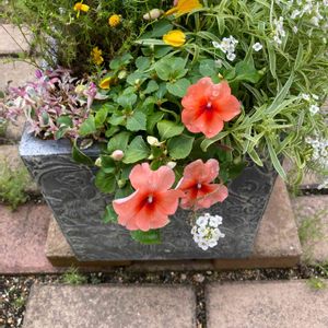 もう1つ寄せ植え( ¨̮ )❥︎❥︎ こちらは更に渋いよ〜 お婆婆色ラクダ色🐪って言わないでね🫠 花日和オリジナルビオラ イリスプリエール カレックス フラゲリフェラ ウエストンリンギア アジュガ ライムブルー アジュガ トリカラー(友達からいただいたもの) イリスプリエールの色が伝わるかなぁ(´◔︎‸◔︎`) ダメだぁ⤵️あっちこっち向いちゃってる なんとも言えない色なんです〜黄色紫水色グレー… あとアジュガ ライムブルーもいいでしょ💛🧡これがメインでもいいくらい好きです もう1つのアジュガ トリカラーは昨日お友達の庭からいただいたもの 他はもともとあったもので こり固まってしまった鉢物は解体に力がいります💦⛏ 筋肉痛になりそうだわ💦💦 でもまだやります…… そうそう…主人がブツブツほざいてます… 「ママはこういう色がいいんだぁ 珍しい色だねぇ なんたらかんたら…」 真っ赤と真っピンクが好きな人にはこの色の良さは永遠に分からないわね 可哀想だわ( ˘-з-)