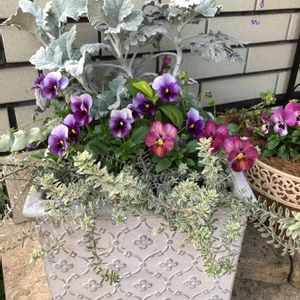 パンジー マリーリーンの寄せ植え💐 大きな鉢で寄せ植えを作るのに憧れて…✨ 園芸店で一目惚れしたシルバーレースも一緒に植えました🌿 可愛い😍