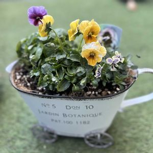 宮崎ビオラと庭人さんビオラの入った 友膳のブリキ鉢は満開状態🌟💐˒˒✧