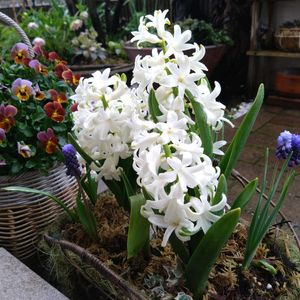 9.4℃🌅/14℃☔ 🧺球根寄植え(pic1) *ヒヤシンス *ムスカリ ラティフォリウム *プスキニア リバノチカ *スイセン サンディスク 満開のヒヤシンスからいい香り` * ˖° ˚˳ ⋆ プスキニアは終わってしまい、スイセンは間に合わなそうです。 球根リレー 🩵➡️🤍💜🔜💛 🧺ビオラ寄植え(pic2〜3) *ゲブラ mixビオラ *夢紡ぎ 夢紡ぎがいよいよ飲み込まれる〜🙀 🧺アネモネ寄植え(pic4) *フルゲンス❤💜🤍