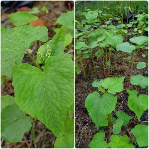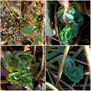種を取って庭にばら撒いたりこぼれた種で増えた西洋オダマキ達が今年の春こそ咲いてくれるかもしれない💓と思いながら見守ってきました。 でも先月の氷点下の日や少しの雪などで今までなんとか青々としていた葉が黄色くなり枯れてしまいました😂(左上) それでも4株あるうちの3株には株元に小さな緑の新芽を見つけることができました❗️生きてるのね💓嬉しいなあ😍 昨年は葉っぱのみでしたが今年こそ咲いている姿を見たい‼️