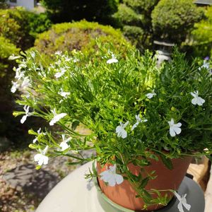 種から育てたロベリアが、白い花を咲かせはじめました。 今は雨水タンクの上で、出番待ちです。☺️ もうすぐデビューかな? \(^^)/