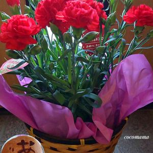 娘から母の日の贈り物が届きました♥🥀 今年も赤いカーネーション🌹 🧺付きの鉢花を贈ってくれました❤️ お花は何度貰っても嬉しいね😍♥️ とってもいい香りがします(ღ˘⌣˘ღ)🌹 箱の中には[おいもや]のありがとう♡お芋どら焼きも🍠 しっとりした生地につぶあんとお芋が入ってめっちゃ美味しかったよ(๑´ڡ`๑)モグモグ 娘よ〜どうもありがとう😆💕