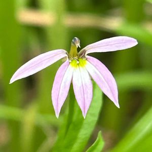 ミゾカクシ(溝隠) キキョウ科 ミゾカクシ属 別名 アゼムシロ(畦筵) 生活場所 水田のそば、小川のそば、濡れた草の中、湿地 花期 5〜10月 ここでは山の水がしみている日当たりの良い草むらの中に生えています 花の大きさは1cmくらい 花冠は5裂し、うち、2個は横向き、3個は下向きに咲く 1️⃣雄性期の花 中央に蛇が鎌首をもたげたように見えるものが葯筒で、雄蕊の葯が合着し、花柱を取り囲んでいる 約筒の先端には毛がありアシカやナマズのヒゲのように見える 2️⃣雌性期の花 雄蕊が花粉を出すと、2裂した雌蕊の柱頭が顔を出す 水道の蛇口に見えてきた 3️⃣横から見ると花びらが半分しかないような不思議な形 4️⃣花の内部は黄緑色の班があり毛がある 葯筒が鳥の顔に見えて、羽を広げているようにも見えて、なんとも不思議な形の花です 毎年同じ時期に、同じ場所でしか咲かない花で、見つけやすいです 溝を隠すまでは咲かないが、草むらにピンクのお花が点々としています 同じ科と属のサワギキョウも似たような花の形です