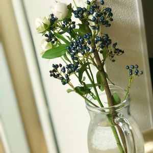 初投稿! お花屋さんで買った白バラと青い実もの。 毎日の癒し🌱