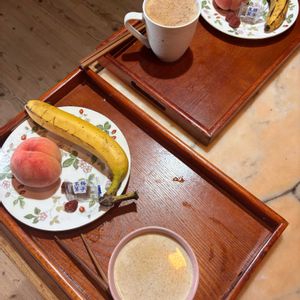 朝ごはん バナナ 白桃 塩黒砂糖 小梅干し これだけでも充分美味しく頂きました。