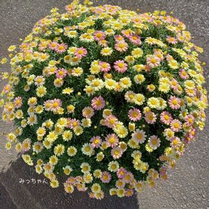 ボンザマーガレットピンクレモネードが 咲いています。黄色とピンクが混ざっています💮🍀