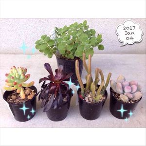 2017年初狩りです😀 アロマティカスのみ名札付きでした。 乙女心?、黒法師?、若緑…にしては緑じゃない?、ブルーヘイズかアメジスチヌム?? お店で名札つけて欲しい💦 明日は仕事始めです。のんびり多肉を眺められるのは今日まで。気持ち切り替えないと!