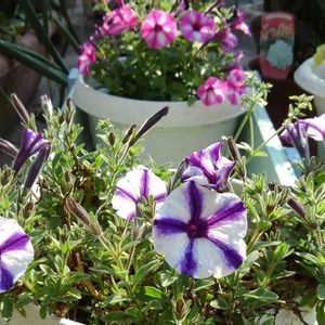 ブルーベリージャムというペチュニアです。 剪定後に、もうじき終わりの忘れな草の鉢に寄せ植え。 たくさん咲き出す前の、可愛いコラボになりました💜