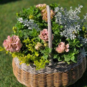〜寄せ植え〜ハンギングバスケット 〜 ペチュニア モカモンブラン ペチュニア レ・ミルティーユ ペチュニア モダンショコラ ハロラゲス、ワイヤープランツ、オレガノ ウンシニア モダンショコラ発売と共にやりたくなった組み合わせ。帰って速攻作りました。😊 ただね、モダンショコラはパッと開かないのが多い💦あと花割れも💦 写真は数日前の。昨日風通しよく切り戻し。モカモンブラン は切り戻しに弱いので軽くね。 言い訳…上から撮った写真でバランス悪いね👎