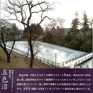 【仙台・冬の風景】 ~日本フィギュアスケート発祥の地・五色沼~ 仙台の青葉城址に登る手前に、五色沼があります。 この五色沼が、日本フィギュアスケート発祥の地とされております。 凍った五色沼を見ると、ホントにスケートリンクのようです。 ただ、今では、スケートができるほどの氷は張らないと思います。 今日まで、全日本フィギュアスケート選手権が開かれていました。 男子優勝で、ソチ、平昌オリンピックの金メダリストの羽生結弦選手も、トリノオリンピックの金メダリストの荒川静香さんも、仙台で、高校まで過ごし、フィギュアスケートの実力をつけました! 五色沼の近くの地下鉄国際センター駅の前には、羽生結弦選手、荒川静香さんのモニュメントが展示されています。 こういうことを書いていると、スケートをしたくなってきました。 でも、私は、もう今では、しない方がいいでしょう~😅 転んだら、痛そう😖冷たそう😵