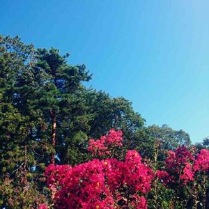 東京・上野の東京国立博物館本館前にある 紅白のサルスベリ (百日紅) きれいに晴れた青空の下、白いサルスベリと赤いサルスベリが並んで、とてもきれいに咲いていました! サルスベリは、百日間、花を咲かせているので、百日紅と名付けられたそうです。 しかし、一つ一つの花がずっと咲き続けているのではなく、一度花が咲いた枝先から再度芽が出てきて花をつけるので、咲き続けているように見えるのだそうです。 そうであっても、夏から初秋、きれいな花を見せてくれるのは、とてもありがたいことですね。