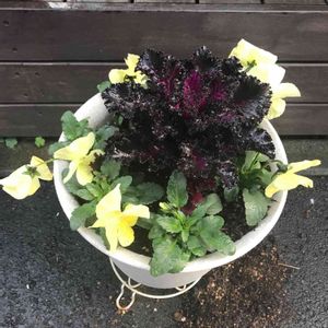 おはようございます🌞 穏やかな朝です😊 フリフリパンジードラキュラ様🧛♀️と同じ日に購入した一株70円の激安ビオラ😆💕 お安いけど、ベルベットな質感が素敵だと思いませんか😍 アリッサムと旦那が貰ってきたノースポールと一緒に寄せました。 でもかなり余裕持って植えたのでスッカスカ🤣 芽が出ちゃったムスカリも仕込んでみました🌱 春には素敵な寄せ植えに変身してくれることを祈って🙏✨