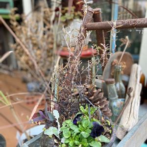 寄せ植えました⑅◡̈* ブラック系 ジャンク雑貨に合わせて"(⌯︎¤̴̶̷̀ω¤̴̶̷́)✧︎ これからは午後から曇る事も多く、デッキの奥の日照時間は極わずか💦 ラダーをデッキ手前。パーゴラ屋根の下に出しました。