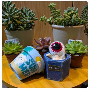 来たぁーー 昨日、編み編みオヤジさま、 ピンポーン、うちに届きましたーー けいこさんの企画にのりたまさんと一緒に当選〜〜〜きゃあ〜〜やったぁーーこの夏、げっそりしていたら、神様ーーけいこさま、ありがとうございますーーー♥♥ 皆様、おめでとうコメ、ありがとうございます😋 けいこさんの愛情、相変わらず濃い〜〜厚い〜〜〜熱い〜〜本当にありがとうございますー可愛い鉢が2つもーそして楽しいお菓子がいっぱい〜〜 おっと、弾かれないようにまずは、うちの多肉ちゃんと〜〜 タチカワバナナ🍌さんの左からムーンストーン、ブラッドロメオ、オレンジマンガン、 このコたち先週の雨でびちょびちょで、鉢から出して、乾燥させていたんですが、無事乾燥!爪もしっかり葉もパッキパキ〜〜このまま優秀に夏越ししてほしいです〜〜 さてオヤジさま3枚目ーー 左上→右へから⬇️⬅️ くたびれたのぅビール🍺でも出るのかぁ? ふぅーー何気にまだ腕立て伏せも出るぞー 逆立ちも得意じゃ~ ゆっくりテレビでも、見せてくれ〜〜 オヤジさま〜〜うちにきてくれてありがとうございます〜〜 いたせりつくせりいたしまーす♥ というわけで、5枚目はみんなで記念写真〜〜皆様への感謝でいっぱいの1枚になりました〜〜😋