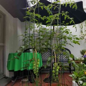 今年もトマトは順調に育っています🎵 昨年のプチトマトは欲張って1本を2本立てにして150個も成らした為 結局半分は美味しくなくて捨てるはめに⤵ 今年は数より質で勝負‼ 中玉トマトにしたので 1本立てで 5段目の花が咲いた所で摘芯 130cm ちょうど支柱の高さまでになりました 大玉は1ヶ所に3個みたいだけど 中玉はどうなんでしょう? 減らした方が良いのかな? 今年は5株あるので 色々試してみようと思います。