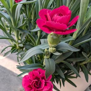 PWマーガレット ❀バニラボネット❀ 3月28日に投稿してから2週間経ちました♪ 2⃣3⃣ 可愛いボネット(帽子)の形のお花が増えて来てます👒✨🥰 1月28日に突風に煽られ、鉢ごと地面に落下して茎の一部分が折れて、株がほぼ半分になってしまいましたが💧(1月29日投稿) 今、株の横幅は、約75cmなので、何も無く成長していたら奥行きも出来て、かなり大きな株になっていたことでしょう🤗 狭いベランダなので、今の半円形で良かったかなぁ〜と思ったり😅 4⃣5⃣ 1月29日、折れてしまった茎をそのまま捨てるには忍びなかったので、6本水挿し(メネデール液使用)にしました♪♪♪ 水挿ししてから2ヶ月程経ち、6本のうち3本に根っこが出て来たので、先日、赤玉土に植え替えました♫ 同じように水挿しで根っこが出たカーネーションも2本一緒に植えました♫(*^^)v