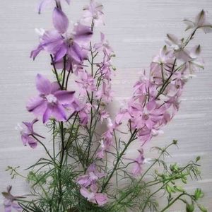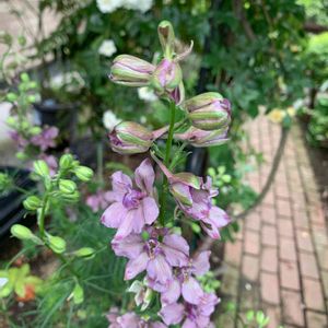 ステキな色のラークスパー チドリソウが咲きました☺️もともと、ジギタリスみたいに存在感あり💦な花より、千鳥草みたいな繊細な花の方が好きで、見ると買って植えていましたが、なかなか思うように咲かず‥倒れたり曲がったり‥今回はラベルの写真のたまらないうす紫色にひかれて植えました🌿 寄せ植えの一部に入ってますが、どんどん背が高くなり、どうなることかと心配していましたが、咲いたらこんなにステキな花でした💐グリーンがかったつぼみもステキです☺️