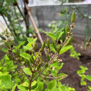 ピンクのラッパのような花を咲かせる姫ライラックは実のかたちも不思議。