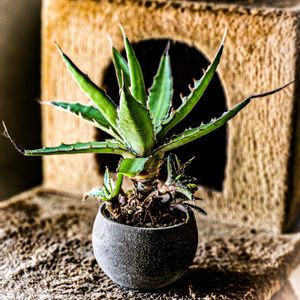 アガベ ロファンサ プラポットで5年ほど放置のロファンサ。 バッチバチ根鉢でワイルドな風貌になっていたので傷んだ下葉を外して根っこを⅔ほどカットして丸陶器鉢に植え替えました。