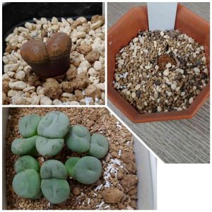 うちの多肉✨メセン【リトープス】 去年の10月にお迎えしたリトープスさん♡ たぶん日輪玉?かな。 同月に開花、今年の2月から4月にかけて脱皮、分頭して2つから4つに増えました。 🔰なのでシワシワになった時も不安でしたが、元気に育ってくれています(o^^o)