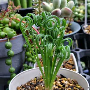 アルブカ スピラリス フリズルシズル 猛暑の間休眠していたフリズルシズルが目覚めました♬ 独特のクルクル葉っぱが伸びて来ました! 落ちた種子から球根が2つ増えました✌️