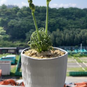 実生アルブカ、咲きましたー💚 嬉し〜〜い😍✨✨ 沢山蒔いたけど、葉が出たのは4つだけで、花が咲いたのはこの子だけでした。 見られて良かったー! クルクル葉っぱも素敵! 大きくなりますように✨