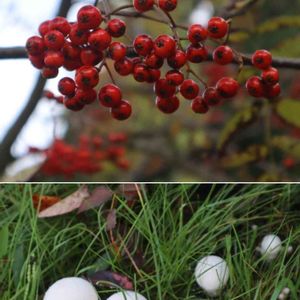 真っ赤なナナカマドの実の足もとに、真っ白な🍄が。