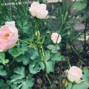 名前もわからないミニ薔薇 葉はボロボロですがオダマキの影でひっそり咲いていました。