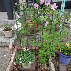 おはようございます😊☀️ クレマチス マーガレットハント たくさんの蕾がついて少しずつ咲いてきました💜 株元のヒューケラが夏の暑さに耐えきれず残念なことになってしまった👼 今回はミニバラのグリーンアイスの鉢植えを置くことにしました✨