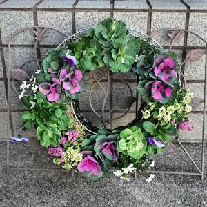 おはようございます😊☀️ 葉牡丹のリース 欲しかった白色の葉牡丹が見つからず、どうにか作ってみたけれど一緒に植え込んだ花はどこを向いているやら…😅