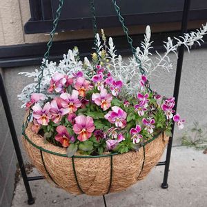 こんにちは😊🌧️ 今年も作ってみた 割れた鉢の寄せ植え💜 花の茎が短いタイプを下に植え込んだ方がよかったかな🤔