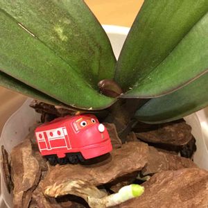 あ、バークチップが挟まってる と思って葉っぱの真ん中にあるものをとろうとすると、新しい葉っぱの赤ちゃんでした。引っ張りかけてました、セーフです。 1年前に新築祝いでもらった胡蝶蘭☺︎少し根腐れしたり葉焼けしたりといろいろ経験しましたが、成長してるみたいで安心♡葉の数を増やして、来年にはまた花芽に会えますように♡