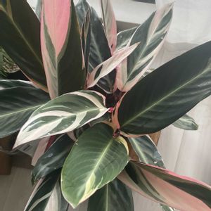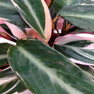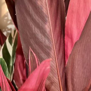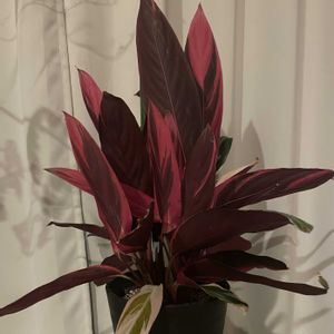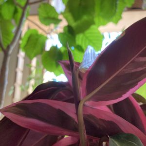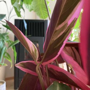【ストロマンテ・トリオスター】 《クズウコン科》 花言葉 「強い気持ち」「あたたかい心」 ストロマンテ・トリオスターは 緑とクリーム色の葉模様が美しく さらに葉裏は鮮やかな赤紫色をしているカラフルな植物です。 葉の裏が 赤紫色をしていることもあり 別名「ウラベニショウ」とも 呼ばれます。 ストロマンテ・トリオスターの葉は光沢もあり、革のような質感で高級感を感じることも特徴です。 夜になると葉が立ち上がり閉じる「睡眠運動」をおこなうという面白い性質を持っています