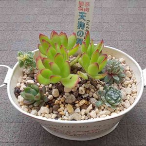 多肉仲間から嫁いできた多肉と、天狗の舞を刈ってきて寄せ植えしました。 爽やかなグリーン。