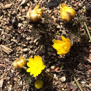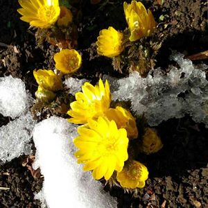 福寿草 別名 ガンジュツソウ 福告ぐ草 一番に春を告げると意味 雪が降ってもお花咲かせています。友人のお庭