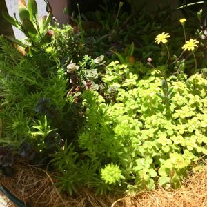 お天気でセダムも元気❣️(^O^) 割り込んでルビーネックレスの花がにょきにょき〜♬♪🌱🌼🌱 ベランダはお日さまの取り合いっこです💦(๑˃̵ᴗ˂̵)