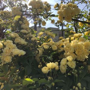 おはようございます。 モッコウバラです💛 今年はオベリスクにも仕立てました。 そちらは日陰になってるので、一部しか咲いてなくて、全体咲くのは今週末になりそうです💦