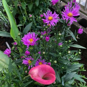 おはようございます😃 爽やかな朝です‼️ 今日のお花はカラーとアスターの自然なコラボです😊💕🎶 去年、アスターを植え替えた時に側に埋まっていた球根が取れずにそのまま、植えてました‼️ ピンク&ピンクが可愛い💕