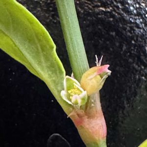 ハイミチヤナギ 這道柳 タデ科 ミチヤナギ属 原産地 ユーラシア大陸 花期 6〜10月 一年草 ・高 さ 10~40cm ・茎 節間が短く、よく分枝 し、地を這って広がる。 ・葉 互生し、青味がかった 緑色、長さ5~20㎜、 幅2~7㎜ 狭卵形 基部には膜質の托葉鞘が ある。 ・花被 長さ2~3.2㎜、5個 に中裂する。 花被片は緑色、 縁が白色~淡紅色 ・蕾 淡紅色。 雄しべ6~8 個 雌しべ1個。 ・痩果は花披に包まれて大きくなり、褐色になった花被に包まれたまま、完熟して落ちる 護岸とコンクリートの歩道の隙間に生えていました。 平たく株基から円形に這って枝を延ばしています。護岸には護岸に沿って植上に伸びていました。