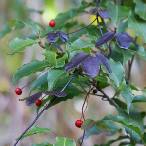 団地の駐車場のフェンスに絡まっているノブドウに、実がたくさんなって綺麗に色づいていました。 5枚目の大きな黒い実は、シャリンバイの実です。