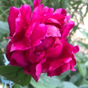 こんばんは🌆 去年、お隣からお裾分けで頂いたピンクのシャクヤクの球根の中からひとつだけボルドー色で咲きました🍷 何年もお隣のシャクヤクを観察してるけど、こんな子咲いたことないんです😅 突然変異⁉️ 隣では栄養不足で咲かなかったけど、我が家が居心地良くて咲いたのかな⁉️ 隣に小さな蕾を付けた茎が上がってるけど、今年は開花は無理なようです💦