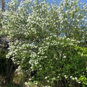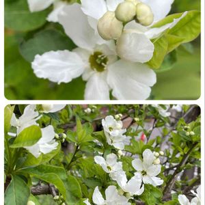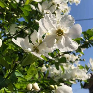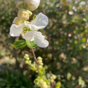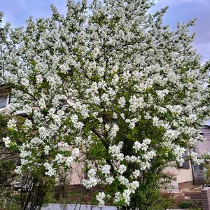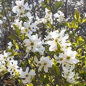 おはようございます😃 去年見つけました。 美しい大きな利休梅です。 私の知る最大の木です。 そろそろ咲いているかと、見に行くと満開です。 朝日に輝いていました。😘 木の白い花でも梅や梨とは違う、優雅な花です。 風になびく姿は抜群です。 元もと中国の花で、明治時代に渡来したようです。 上品な雰囲気から茶花に使われて、茶人利休の名にちなんで付けられた名前。 利休が好んで使った訳ではないようです。😅
