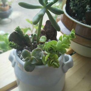 こちらの陶器製ミルク缶(缶じゃないけど)は前から家にあったやつ。 底穴を開けて、これもサボテンよりは多肉だろうと植えてみたんですが⋯ いやぁ、これは自分的には30点だわ ( ๐_๐) とにかくグラグラしてただ乗っけてるだけみたいな感じ。 変にいじると全部崩壊しちゃうのでもうこれでいいや(投げやり) なんでこうも葉(肉)がポロポロ落ちるもんだか (´・c_・`)