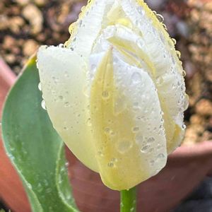 雨の中☔️💧いっぱいです〜‼️ 我が家の一番花さん🌷 今年はなんて早いのでしょう🤍