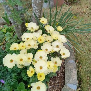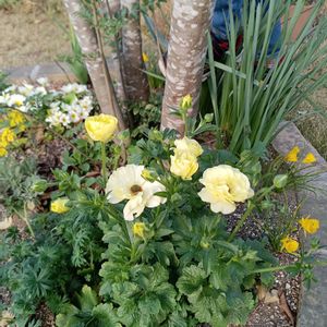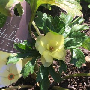 ラナンキュラスラックス・ハリオス 淡いレモン色とふわふわの花びらが やさしい雰囲気です。 手前のビオラはロカハーツなんですが なぜかこの一株だけすごく良い香りです。 離れた場所にいても あれ?どこかでバラが咲いてる?と思うくらい 紅茶のような本当に甘い香り🫖 匂いのもとを辿っていった時は ビオラかい!とびっくりしました。 他のビオラ(ロカハーツも含め)は 普通の花の香りなのに不思議です。 個体差があるのか タネを採ってみようかなぁ🌱