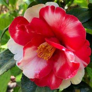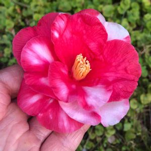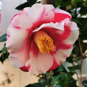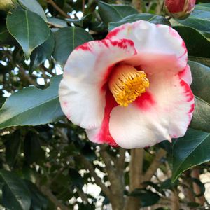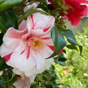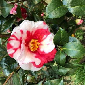 《椿・岩根絞り》 隣にある実家の庭に次々と椿が咲いてます。これは、岩根絞りと言い、白地に紅色の絞りが入る大輪の花です。昨年はあまり花が付かなかったのですが、今年は100個以上の花が見れます😵🌀。大輪の花なので、とても豪華です😊💕。 八重咲き、大輪 抱え咲き〜平開き咲き 樹形…横張り性