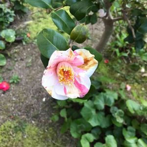 椿・岩根絞り。 ようやく開花し始めたかと 思えば外側の何層かの花弁を枝に残したまま、 ポトリと内側の花が落ちました⤵︎ えええ👀💦どうしたん❓